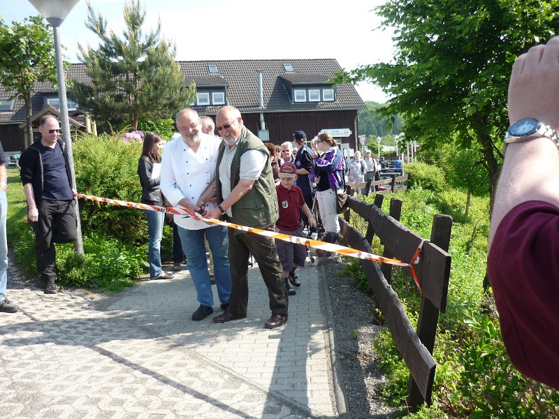 Mit vereinten Kräften wird das symbolische Absperrband zerschnitten.